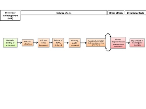 This AOP is an extension of AOP 13 linking NMDAR chronic inhibition during brain development to impairment of learning and memory. It links chronic NMDA receptors inhibition during brain development to Adverse Outcomes, i.e. neurodegeneration in hippocampus and cortex with amyloid plaque deposition and tau hyperphosphorylation and impairment of learning and memory, which are considered as hallmark of Alzheimer's disease. It introduces another KE, Neuroinflammation, which is involved in several neurodegenerative diseases. With Neuroinflammation and Neurodegeneration, this AOP connects to AOP 48, where in adult brain, « neuroinflammation » leads to « Neurodegeneration » ; « Neurodegeneration » leads to « Decreased neuronal network function », which finally leads to « Impairement of learning and memory ». Both neurodegeneration and cognitive deficits are observed in Alzheimer’s pathology. But as neurodegenerative diseases are complex and multifactorial, the authors proposed two Adverse outcomes: one at the organism level « Impairment of learning and memory», and one at the organ level, « neurodegeneration ». Both are regulatory endpoints. This AOP integrates in the network of AOPs relative to neurotoxicity testing.