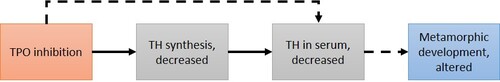 • Haselman et al. (2020) also specifically addressed temporal effects of thyroid hormone synthesis inhibition using model TPO inhibitors methimazole, 6-propylthiouracil and 2-mercaptobenzothiazole. This study aimed to characterize effects on thyroid biochemistry both temporally and dose-response from exposure to the three chemicals throughout a 10 day period during pro-metamorphosis and link those effects to metamorphic success/failure (AO). Thyroid hormone synthesis in the gland (KE1) was significantly decreased by 2 d of exposure whereas significant decreases in circulating TH did not occur until 7 d of exposure. The authors defined the AO as the time to reach metamorphic climax, so the temporal concordance with the AO is an artifact of the study design. However, based on the developmental staging data, there appears to be temporal concordance with the AO, as the effect on metamorphic rates gains resolution over time and with increasing levels of exposure.