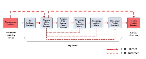 Temporal concordance among the key events and adverse effect: There are two aspects of the temporal concordance of the key events in a developmental AOP. The first is the temporal concordance refers to the degree to which the data support the hypothesized sequence of the key events; i.e., the effect on KE1 is observed before the effect on KE2, which is observed before the effect on KE3, and so on. This translates to the temporal concordance of the AOP from TPO inhibition to decreased TH synthesis, reduced circulating TH concentrations, decreased nervous system TH, altered gene expression and anatomy in the hippocampus, and subsequent alterations in hippocampal physiology that result in decrements in cognition. The strength of the temporal concordance between these KEs varies from weak to strong (see Appendix Tables and individual KEs for detailed information). There is strong evidence for the early direct KEs from both empirical and modeling studies, and for many of the later KEs via the indirect KERs. The temporal concordance between TPO inhibition and TH synthesis is clearly evidenced by data from ex vivo and in vitro studies, as well as computational models (Leonard et al., 2016; Degon et al., 2008; Zoeller and Crofton, 2005; Cooper et al., 1983; Goldey et al. 1985; Christenson et al 1995). Data supporting the temporal concordance for the later KEs, i.e., from serum TH to changes in hippocampal physiology are limited or lacking.