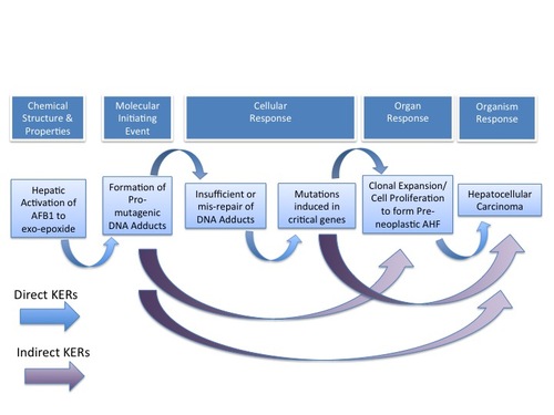 Aflatoxin B1 (AFB1), with ubiquitous exposure and a rich database, was selected as a case study for development of an AOP on mutagenic MOA for cancer. AFB1 has been determined to induce the AO hepatocellular carcinoma (HCC) via a DNA-reactive MOA in many species, including humans. The sequential KEs identified for AFB1 are as follows: pre-MIE: Hepatic metabolic activation; MIE: Formation of a pro-mutagenic DNA adduct (N7-AFB1-guanine or AFB1-FAPy); KE#1: Inadequate or mis-repair of the pro-mutagenic DNA adducts; KE#2: Induced mutation in critical gene(s); KE#3: Cellular proliferation and clonal expansion of mutant cells (pre-neoplastic lesions); AO: HCC