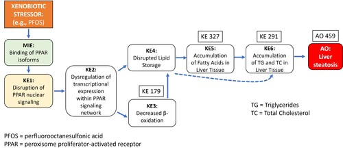 The weight of evidence from the literature indicates the potential for the molecular initiating even (MIE) of PFOS binding to the lipid-binding site of PPAR isoforms resulting in the key event of dysregulation of PPAR nuclear signaling (KE1). This KE results in the downstream KE of impacted regulation of diverse transcriptional expression pathways (KE2) that subsequently control KEs of altered lipid metabolism and transport. The effects of these KEs thus affect systemic lipid profiles resulting in the KEs of lipid accumulation in livers and hepatocellular vacuolation. Finally, these key events drive the adverse outcome (AO) of liver steatosis. Additional, more systemic AOs may also be affected by this MIE and cascade of KEs that can ultimately alter global energy metabolism, such as AOs of impacted growth and reproduction.