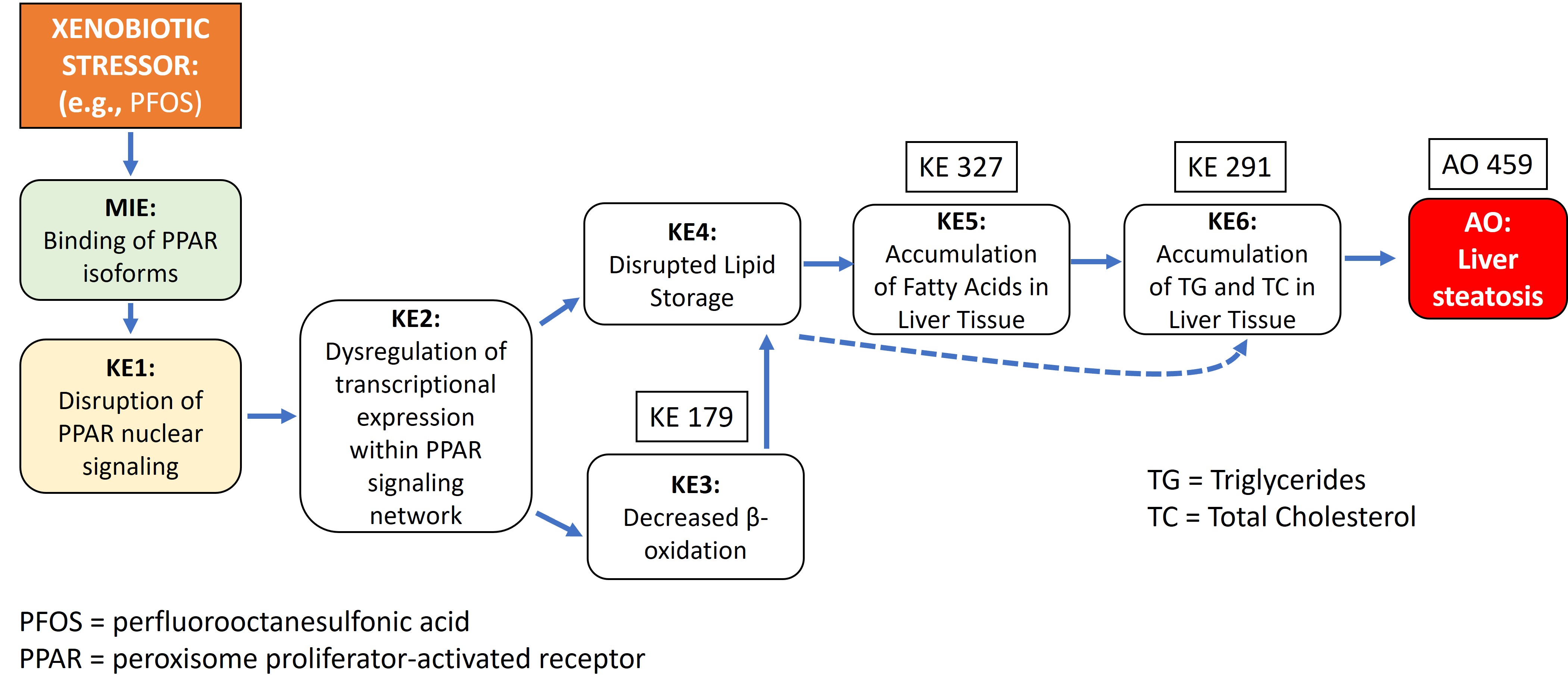 This AOP describes the chain of events where the molecular initiating event (MIE) of a xenobiotic stressor (e.g., perfluorooctanesulfonic acid (PFOS)) binding to the ligand-binding domain of the peroxisome proliferator-activated receptor (PPAR) causes a cascade of key events (KEs) including altered transcriptional expression of genes involved in lipid metabolism leading to impacted lipid transport, metabolism, and storage, ultimately leading to lipid accumulation in the liver and the adverse outcome (AO) of liver steatosis. We explore this pathway by examining the effects of a prototypical stressor, PFOS. Specifically, ligand binding analyses and molecular modeling studies have indicated the potential for PFOS to bind to the lipid-binding domain of various PPAR isoforms (the MIE) resulting in disruption of PPAR nuclear signaling (KE1). Disruption of PPAR nuclear signaling leads to KE2 in which the activity of PPAR as a transcriptional regulator is altered affecting transcriptional expression of a suite of genes within the PPAR signaling network. Transcriptional studies have shown that exposure to PFOS results in broad dysregulation of gene expression for a suite of genes involved in lipid metabolism which ultimately result in decreased β-oxidation (KE3) and disrupted lipid storage (KE4). Altered expression of β-oxidation related genes (acox1, acadm, cpt1a, cyp4a1) have been observed in conjunction with inhibition of β-oxidation in PFOS exposures. Also, transcriptional expression of genes involved in both lipogenesis and lipid transport including, apoa, apoe, acacb, CD36, fabp isoforms, Plin isoforms and lpl, have been observed to be affected by PFOS exposure in conjunction with disrupted of lipid storage (KE4). Alterations in fatty acids, triglycerides (TG), and total cholesterol (TC) accumulation and profiles have been observed in the livers of PFOS-exposed vertebrates including fish, reptiles, birds, and mammals and serve as evidence of KE5 (accumulation of fatty acids) and KE6 (accumulation of TG/TC) in liver tissue. KE5 and KE6 thus contribute to hepatocellular vacuolation as seen in multiple histopathological assessments performed on livers of vertebrate species exposed to PFOS, including work funded under SERDP project ER20-1542 (Mylroie et al, manuscript in development). Finally, KE5 and KE6 ultimately drive the adverse outcome (AO) of liver steatosis. Additional, more systemic AOs may also be affected by this MIE and the cascade of KEs that can ultimately alter global energy metabolism, such as AOs of impacted growth and reproduction.