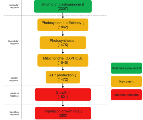 Although useful as agricultural compounds, PSII inhibitors have elicited extreme environmental concerns considering how chemically stable they are, moderately water soluble, and resistance to breakdown and movement throughout the ecosystem (Brock, Lahr and Van den Brink, 2000). These chemicals are often found in surface and ground water, especially in agriculture areas as it is introduced through run off and leaching. Their prolonged environmental persistence and mobility mean that they can affect non-target organisms in aquatic and terrestrial habitats long after application. Primary producers, such as algae, aquatic macrophytes and terrestrial plants, are particularly susceptible to PSII herbicides, since they contain highly conserved QB binding sites the same as the targeted weed species. Even low environmentally relevant concentrations can negatively affect photosynthetic efficiency, growth rates and normal primary productivity (Oettmeier, 1999). These effects may cascade through ecosystems and change species composition, community structures, and stability and functioning of whole ecosystems. To improve mechanistic insight and risk assessment of herbicides that inhibit photosystem II, AOP#567 (Binding of plastoquinone B causing a lowered population growth rate through a reduced population photosystem II efficiency) was developed to illustrate how the binding of PSII inhibitor to the QB site of the D1 protein interferes with photosynthetic electron transport and leads to a decreased growth rate of populations on primary producers.