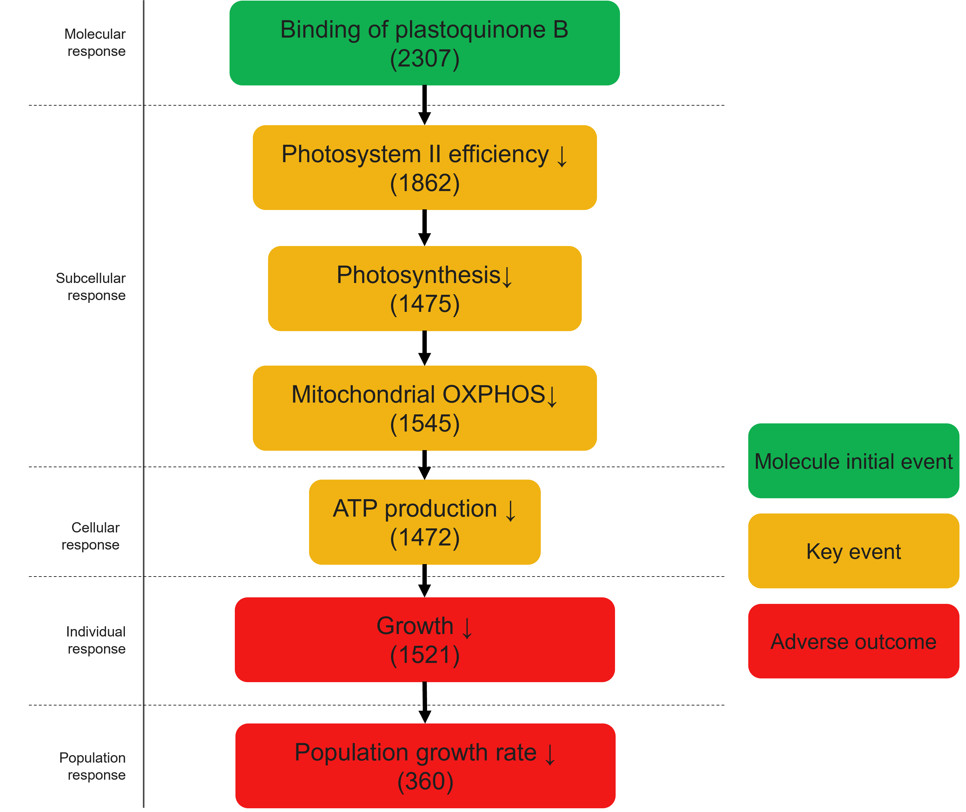 The MIE constitutes the competitive binding of PSII inhibitors to the QB site, which disrupts the transfer of electrons between QA and QB. This blockage has a direct inhibitory impact on the functioning of the PSII complex and causes the first downstream KE: the inhibition of PSII efficiency, which is typically reported as Fv/Fm ratio or ΦPSII. The lower PSII efficiency is an indication of reduced energy conversion in the light-dependent components of photosynthesis. As a logical physiological consequence, this leads to a decrease in carbon fixation and the availability of ATP and NADPH, both of which are essential for cellular growth. here is a consequent decrease in the rate of organismal growth, particularly on the taxa that grows fast like phytoplankton and aquatic plants.
