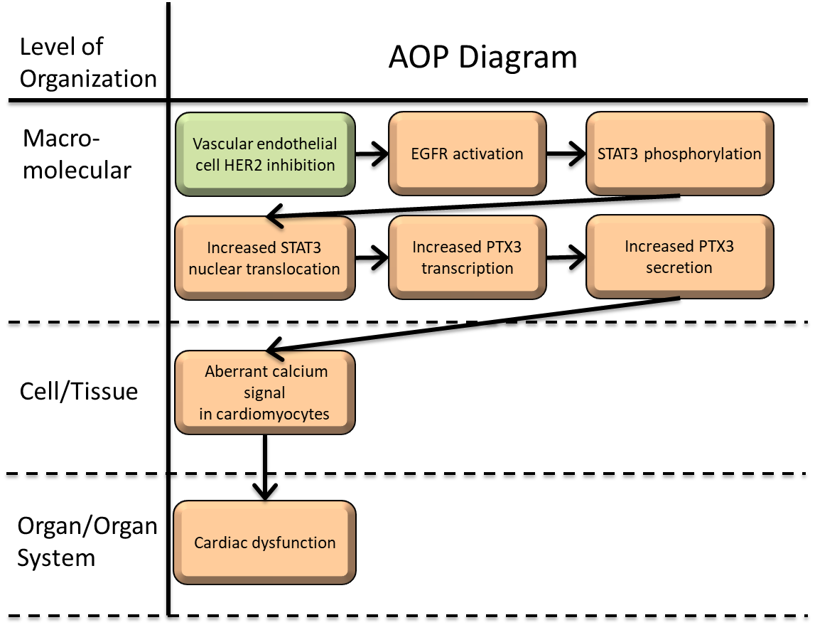 An adverse outcome pathway (AOP) has been proposed, potentially mediated by vascular endothelial HER2 inhibition. This AOP may clarify molecular mechanisms underlying cardiotoxicity. In this AOP, the Molecular Initiating Event (MIE) is " Vascular endothelial cell HER2 inhibition," triggering six Key Events (KEs): " EGFR activation, " " STAT3 phosphorylation, " " Increased STAT3 nuclear translocation, " " Increased PTX3 transcription, " "Increased PTX3 secretion, " and "Aberrant calcium signal in cardiomyocytes. " Ultimately, this pathway culminates in the Adverse Outcome (AO) of Cardiac dysfunction.