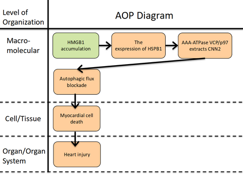 A specific adverse outcome pathway (AOP) has been characterized, mediated by High Mobility Group Box 1 Protein (HMGB1), providing mechanistic insights into cardiotoxicity. In this AOP, the Molecular Initiating Event (MIE) is "HMGB1 accumulation," triggering four Key Events (KEs): " The expression of HSPB1," "AAA-ATPase VCP/p97 extracts CNN2," "Autophagic flux blockade," and "Myocardial cell death." Ultimately, this pathway culminates in the Adverse Outcome (AO) of Heart injury.