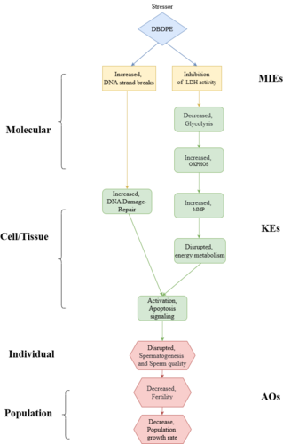 This Adverse Outcome Pathway (AOP) delineates the male reproductive toxicity of decabromodiphenyl ethane (DBDPE), a widely used novel brominated flame retardant (NBFR), integrating evidence from ex vivo zebrafish spermatozoa, in vivo zebrafish models, and in vitro mouse spermatogonial (GC-1) cell studies. The AOP development addresses growing concerns over DBDPE’s environmental persistence, bioaccumulation potential, and reproductive risks, particularly given its role as a replacement for legacy BFRs with poorly characterized hazards.