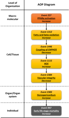 This Adverse Outcome Pathway (AOP) describes the mechanistic sequence linking activation of peroxisome proliferator-activated receptor alpha (PPARα) to early life stage mortality in aquatic vertebrates. Activation of PPARα increases fatty acid β-oxidation, which disrupts oxidative phosphorylation (OXPHOS) coupling and elevates reactive oxygen species (ROS) production. The resulting mitochondrial dysfunction and oxidative stress decrease vascular integrity, induce hemopericardium, and culminate in early developmental mortality. The AOP integrates well-established molecular mechanisms of energy metabolism with observable developmental endpoints in fish embryos. It provides a biologically coherent framework to assess developmental toxicity of PPARα agonists, including per- and polyfluoroalkyl substances (PFAS) and fibrates, supporting new approach methodologies (NAMs), read-across, and next-generation risk assessment applications.