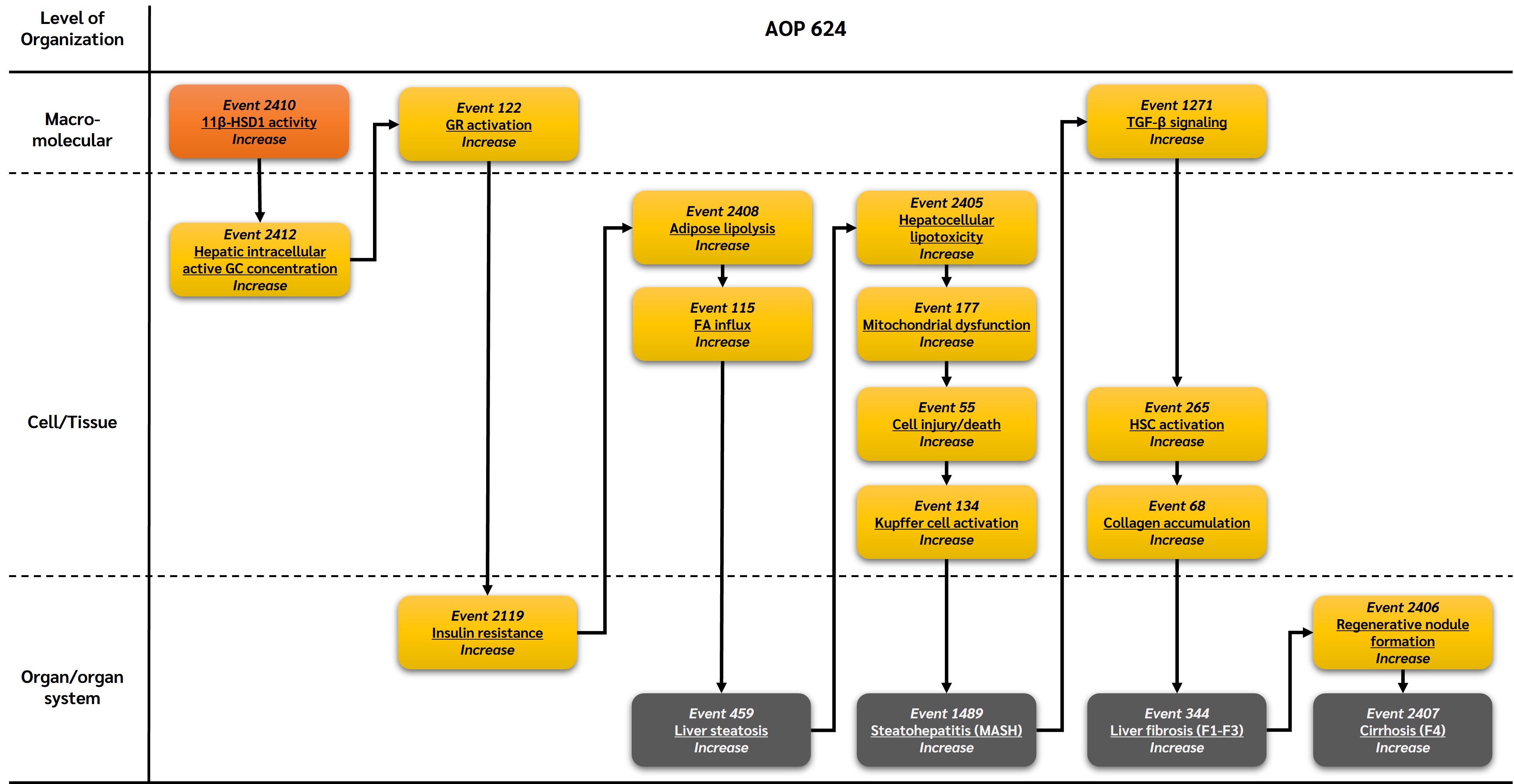 This AOP was developed to capture the biological plausibility and mechanistic continuity between altered GR signaling and MASLD progression, with a specific emphasis on insulin resistance–associated mitochondrial dysfunction as a unifying driver of disease advancement. The pathway reflects clinically relevant disease stages and aligns with regulatory interest in identifying upstream endocrine-mediated mechanisms contributing to chronic metabolic liver disease.