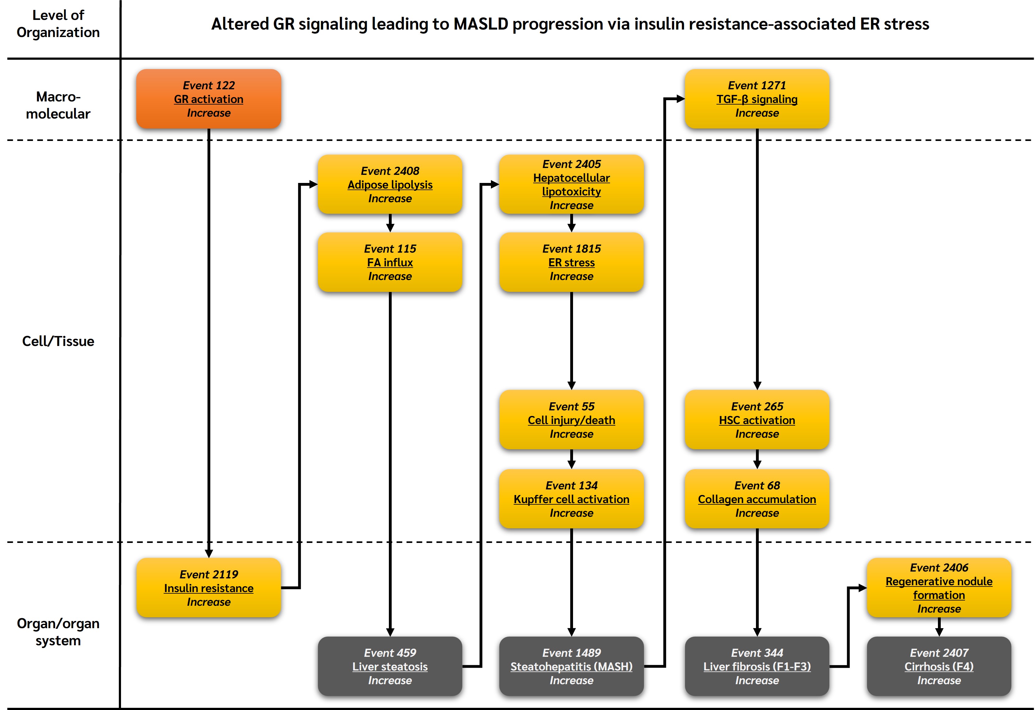 Glucocorticoid receptor (GR) signaling plays a key role in metabolic homeostasis, insulin sensitivity, and lipid flux regulation. Altered GR signaling—whether due to dysregulation or chemical interference—can induce systemic insulin resistance, increased adipose lipolysis, and hepatic lipid influx, thereby promoting ER stress. This AOP was developed to explicitly capture ER stress as a mechanistically distinct and biologically important mediator linking GR dysregulation to MASLD progression.