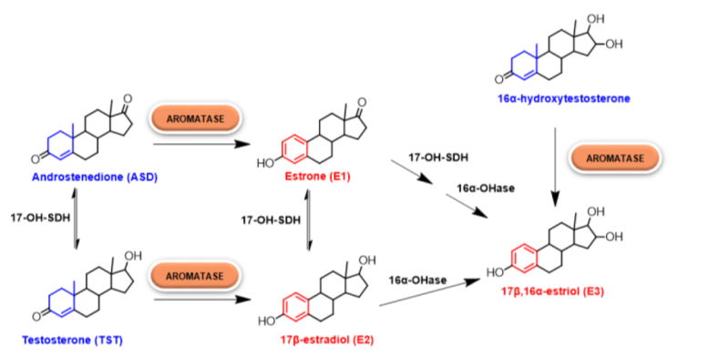 Aromatase converts, through aromatization, androstenedione and testosterone to estrone (E1) and estradiol (E2), respectively. Aromatase induction could increase circulating estrogens (E1, E2) available to estrogenic activation pathways in estrogenic sensitive tissues (uterus).