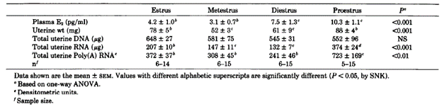 Table 4. Uterine weight, DNA, RNA, and plasma concentrations of E2 during the estrous cycle of C57BL/6J mice. from Bergman et al., 1992