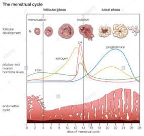 The uterus in rodents and the human undergoes cyclical changes of growth and degeneration (Fig. 10 and 11). In both species, estrogens produced from the developing follicles stimulate endometrial growth, and progesterone is responsible for converting the estrogen primed endometrium into a receptive state. In rodents, if pregnancy does not occur, dioestrus (secretory phase in humans, cycle days 15–28) terminates with regression of the corpus luteum, and the endometrium is resorbed (menstruation in humans, cycle days 1–5). During proestrus (proliferative phase in humans, cycle days 6–14) follicles develop and start to produce estrogens that stimulate endometrial growth. During oestrous (peri-ovulatory period in humans, cycle days 13–15) ovarian follicles mature. The magnitude of uterine growth stimulation is largely dependent upon the duration of bioavailable E2 and receptor interaction (Groothius et al., 2007).