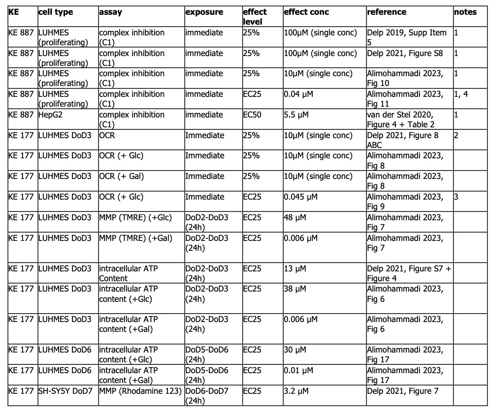 Tebby C, Gao W, Delp J, Carta G, van der Stel W, Leist M, Jennings P, van de Water B, Bois FY. A quantitative AOP of mitochondrial toxicity based on data from three cell lines. Toxicol In Vitro. 2022 Jun;81:105345. doi: 10.1016/j.tiv.2022.105345. Epub 2022 Mar 10. PMID: 35278637.