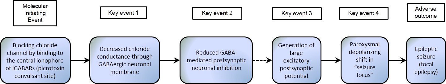 This AOP begins with a molecular initiating event (MIE) where a chemical binds to the picrotoxin binding site at or near the central pore of the ionotropic GABA receptor complex causing blockage of the ion channel. As a result, the first key event (KE) is a decrease in inward chloride conductance through the ligand-gated ion channel. This leads to the second KE, a reduction in postsynaptic inhibition, reflected as reduced frequency and amplitude of spontaneous inhibitory postsynaptic current (sIPSC) or abolishment of GABA-induced firing action in GABAergic neuronal membranes. Consequently, the resistance of excitatory neurons to fire is decreased, resulting in the generation of a large excitatory postsynaptic potential (EPSP), i.e., the third KE. The large EPSP is reflected as a spike (rise) of intracellular Ca2+ observed in the affected region, where a large group of excitatory neurons begin firing in an abnormal, excessive, and synchronized manner. Such a giant Ca2+-mediated excitatory firing (depolarization) causes voltage-gated Na+ to open, which results in action potentials. The depolarization is followed by a period of hyper-polarization mediated by Ca2+-dependent K+ channels or GABA-activated Cl− influx. During seizure development, the post-depolarization hyperpolarization becomes smaller, gradually disappears, and is replaced by a depolarization. This characteristic depolarization-shrinking hyperpolarization sequence of events represents the fourth KE known as “paroxysmal depolarizing shift” (PDS), which forms a “seizure focus”. A PDS is, essentially, an indication of epilepsy at the cellular level, which serves as the foci to initiate the adverse outcome at the organismal level of epileptic seizure. The severity of symptoms is often dose- and duration- dependent, while the toxicological symptoms are associated with the type and location of affected iGABARs. Mortality can occur if the individual sustains a prolonged or pronounced convulsion or seizure. Neurotoxicity, of which seizures are an end point, is a regulated outcome for chemicals. This AOP allows for screening chemicals for the potential to cause neurotoxicity through the use of in vitro assays that demonstrate binding to the picrotoxin site, electrophysiological assays demonstrating depolarization of neuronal membranes, or electroencephalography that records electrical activity of the adult brain.