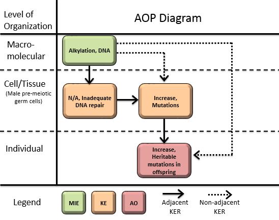 In this AOP, a compound capable of alkylating DNA is delivered to the testes causing germ cell mutations and subsequent mutations in the offspring of the exposed parents. The AOP requires uptake of the parent compound or metabolite in spermatogonia and interaction with DNA in those cells. DNA alkylation in male pre-meiotic germ cells is the molecular initiating event. A variety of different DNA adducts are formed that are subject to DNA repair; however, at high doses the repair machinery becomes saturated or overwhelmed. The fate of remaining adducts includes: (1) attempted DNA repair by alternative DNA repair machinery, or (2) no repair. Key event (KE) 1 is insufficient or incorrect DNA repair. Lack of repair can lead to replication of adducted DNA and ensuing mutations in male pre-meiotic germ cells (KE2). Mutations that do not impair spermatogenic processes will persist in these cells and eventually be present in the mature sperm. Thus, the mutations can be transmitted to the offspring (adverse outcome – inherited mutations). It is well documented that mice and other animals exposed to alkylating agents develop mutations in male pre-meiotic germ cells that are then found in sperm, resulting in the transmission of mutations to their offspring. There is a significant amount of empirical evidence supporting the AOP and the overall weight of evidence is strong. Although there are some gaps surrounding some mechanistic aspects of this AOP, the overarching AOP is widely accepted and applies broadly to any species that produces sperm.