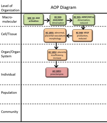 A graphical representation of the AOP.This graphic should list all KEs in sequence, including the MIE (if known) and AO, and the pair-wise relationships (links or KERs) between those KEs.
