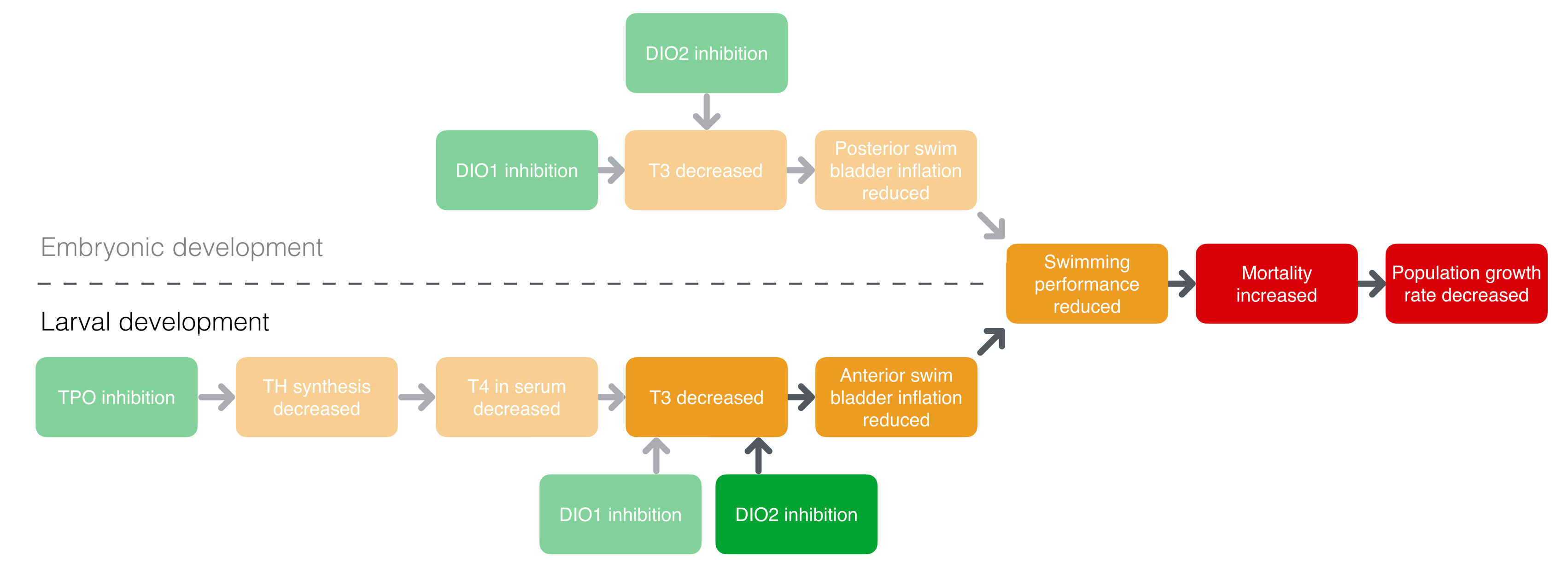 A growing number of environmental pollutants are known to adversely affect the thyroid hormone system, and major gaps have been identified in the tools available for the identification, and the hazard and risk assessment of these thyroid hormone disrupting chemicals. Villeneuve et al. (2014) discussed the relevance of swim bladder inflation as a potential key event and endpoint of interest in fish tests. Knapen et al. (2020) provide an example of how the adverse outcome pathway (AOP) framework and associated data generation can address current testing challenges in the context of fish early-life stage tests, and fish tests in general. While the AOP is only applicable to fish, some of the upstream KEs are relevant across vertebrates. The taxonomic domain of applicability call of the KEs can be found on the respective pages. A suite of assays covering all the essential biological processes involved in the underlying toxicological pathways can be implemented in a tiered screening and testing approach for thyroid hormone disruption in fish, using the levels of assessment of the OECD’s Conceptual Framework for the Testing and Assessment of Endocrine Disrupting Chemicals as a guide. Specifically, for this AOP, deiodinase inhibition can be assessed using an in chemico assay, measurements of T3 levels could be added to the Fish Embryo Acute Toxicity (FET) test (OECD TG 236), the Fish Early Life Stage Toxicity (FELS) Test (OECD TG210) and the Fish Sexual Development Test (FSDT) (OECD TG 234), and assessments of anterior chamber inflation and swimming performance could be added to the FELS Test and FSDT.