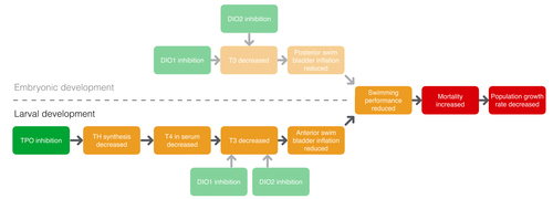 - Thyroperoxidase inhibition leading to increased mortality via reduced anterior swim bladder inflation: https://aopwiki.org/aops/159