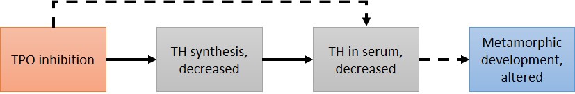 This AOP describes how decreased thyroid hormone (TH) synthesis via chemical inhibition of thyroperoxidase (TPO) causes delayed amphibian metamorphosis, or in extreme cases, arrested development. Amphibian metamorphosis is mediated by TH and successful completion of metamorphosis is generally required for organism survival. TPO is a critical enzyme in the thyroid hormone synthesis pathway that iodinates tyrosyl residues of thyroglobulin and also couples the iodinated tyrosyl residues to form thyroxine (T4). Conversion of T4 to the active hormone, triiodothyronine (T3), is catalyzed by the major activating enzyme, type II iodothyronine deiodinase (see DIO2 AOP 190), located within organs and tissues. T3 then binds to thyroid hormone receptor (THR) along with other cofactors allowing transcriptional gene activation. This T3-mediated gene expression drives the anatomical and physiological changes encompassed by the metamorphic process including limb emergence and development, lung development, gill and tail resorption, gut remodeling, metabolic profile changes in the liver, skin keratinization, etc. The weight of evidence for this AOP is strong, as TPO inhibition has been studied extensively in amphibian model species Xenopus laevis during larval development. Model TPO inhibitors methimazole and 6-propylthiouracil, in addition to other TPO inhibitors such as 2-mercaptobenzothiazole and benzophenone-2, have been tested in this species using several in vivo study designs, some aiming to characterize temporal profiles of glandular hormone levels in addition to serum hormone levels and associated thyroid gland histopathology. These studies lend strong support for essentiality of events proximal to, and including, the MIE. Downstream, the relationship between blood and tissue TH levels is driven by a host of active transporters that have begun to be characterized in mammalian models, whereas THR-mediated gene expression profiles have been studied extensively in the amphibian model. However, nuances of molecular mechanisms at the level of the tissues may lack importance with regard to predicting apical outcomes due to the strong indirect quantitative relationship between circulating hormone levels and metamorphic success.