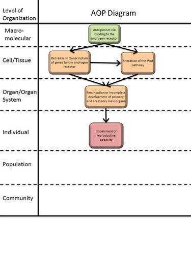 This adverse outcome pathway details the linkage between the antagonism of the androgen receptor (AR) leading to adverse effects in the male foetus. For a more detailed explanation of this pathway, with supporting references, please refer to the project report to the OECD [1]. The AR is involved in the mediation of various cellular processes including proliferation, differentiation and apoptosis in many tissues. The two main events regulated by AR mediated gene expression are urogenital tract differentiation during gestation and sexual changes during puberty. The AR can be activated by the binding of the endogenous androgens testosterone and its metabolite 5-alpha-dihydrotestosterone (DHT), which can activate gene expression at the transcription level. In mammals, virilisation of the external genitalia is driven by DHT while the differentiation of the Wolffian duct is driven by testosterone. Chemicals which bind to the AR may cause disruption by agonism, antagonism or by both mechanisms. Agonists will mimic the action of the endogenous androgens, whilst antagonists will block the receptor and prevent activation. Androgen receptor antagonists divide into steroid-like and non-steroidal compounds. Several classes or chemical categories are indicated by the data [2][3]. These include the steroidal class (cyproterone acetate), the flutamide/ “aryl amide” class which includes bicalutamide, linuron and hydantoin analogs (such as nilutamide, vinclozin), the quinoline analog class, and the phthalimide derivatives. The best characterised class are synthetic anilides for which the model compound is flutamide.