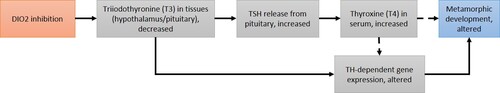 This putative AOP describes the potential for an adverse outcome resulting from the inhibition of Type 2 iodothyronine deiodinase (DIO2) during amphibian metamorphosis. Initial development of this AOP is based largely on literature in which amphibian deiodinases are genetically disrupted or blocked by the deiodinase inhibitor iopanoic acid, and prediction from tissue expression patterns. Thyroid hormones (THs) are essential for normal sequential development of amphibian tissues and organs, and activities of the three deiodinases found in amphibians, as in mammals, function in a highly regulated balance. Chemical inhibition of DIO2, the molecular-initiating event (MIE), results in decreased transformation of thyroxine (T4) to the active form, 3,5,3’-triiodothyronine (T3) in peripheral tissues. Chemicals that interfere with the DIO2 catalyzing reaction of T4 to T3 have the potential to cause insufficiency of the active form that may result in altered metamorphosis. Adverse consequences of T3 insufficiency may vary based on timing of exposure and produce different effects at different developmental stages. For example, T3 insufficiency due to DIO2 inhibition in the African clawed frog, Xenopus laevis, within several days post-fertilization (pre-metamorphosis) could affect brain development, and could alter T4/T3 feedback. It has been found that DIO2 does not regulate T3 levels in serum. However, D2 inhibition in peripheral tissues through the larval phase and post-metamorphic climax may cause alterations in limb development, intestinal remodeling, gill resorption and/or tail resorption.