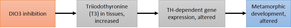 This putative AOP describes the potential for an adverse outcome resulting from the inhibition of Type III iodothyronine deiodinase (DIO3) during amphibian metamorphosis. Initial development of this AOP is based on literature in which amphibian deiodinases are genetically disrupted and prediction from tissue expression patterns. Chemical inhibition of DIO3, the molecular-initiating event (MIE), results in decreased transformation of thyroxine (T4) to the inactive form, 3,3’,5’-triiodothyronine (reverse T3, or rT3) and also decreased transformation of T3 to inactive form T2 in peripheral tissues. Thyroid hormones (THs), including appropriate levels of the inactive rT3 form, are essential for normal sequential development of amphibian tissues and organs, and activities of the three deiodinases found in amphibians, as in mammals, function in a highly regulated balance. Therefore, chemicals that interfere with the DIO3 catalyzing reaction of T4 inner-ring deiodination (IRD) to rT3 have the potential to cause overabundance of T4 as well as the active T3 form, potentially resulting in altered metamorphic development. Adverse consequences of rT3 insufficiency may vary based on timing of exposure and produce different effects at different developmental stages. In the African clawed frog, Xenopus laevis, DIO3 seems to be predominant during the early pre-metamorphosis development phase, protecting tissues from the actions of TH. Inhibition of DIO3 could alter T4/T3/rT3 feedback balance causing events that normally occur during pro-metamorphosis and post-metamorphic climax to occur too early and result in alterations in limb development, intestinal remodeling, gill resorption and/or tail resorption.