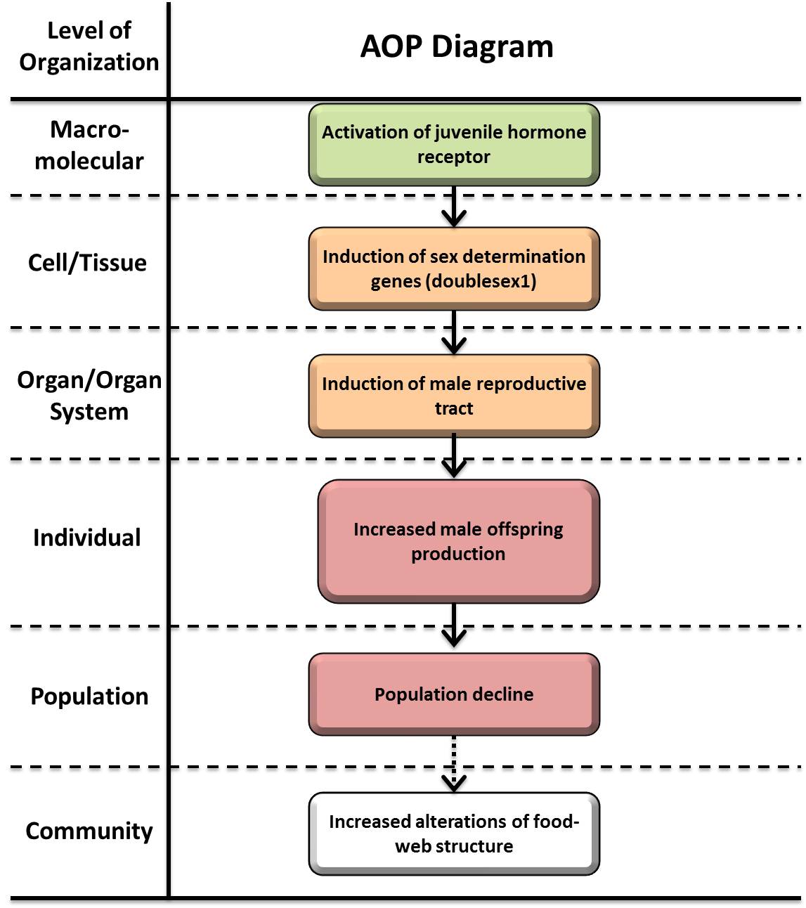 Endocrine disruption (ED) associated with environmental sex determination (ESD) and reproduction effects has been frequently reported in various ecotoxicologcail studies with crustaceans, such as daphniids (reviewed in (LeBlanc and Medlock, 2015)). Daphniids normally go through parthenogenic reproduction cycles in which only female offspring are produced. When under environmental stress (e.g. chemical exposure, short length of daylight, food shortage and high population density), a switch of reproductive strategy from asexual to sexual reproduction occurs and male offspring are produced. As an indicator of ED, the induction of male offspring is used as an important endpoint in daphnia toxicity tests. It has been widely recognized that analogs of the crustacean juvenile hormone (JH), methyl farnesoate (MF) are able to bind and activate the crustacean JH receptor, methoprene tolerant (Met), thus inducing the putative sex determination genes, doublesex genes, and causing male offspring formation. The induction of male neonates is usually associated with reduced fecundity and population decline as adverse ED effects. The existing evidences from different studies currently support the causal relationships between the biological events occurred in daphniids after exposure to JH analogs and subsequently form an adverse outcome pathway (AOP) as proposed herein.