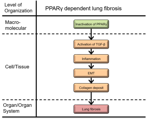 Pulmonary fibrosis is a respiratory disease in which scars are formed in the lung tissues, leading to serious breathing problems. It is an immunological process that is known to be regulated by the immune modulator Peroxisome proliferator-activated receptors γ (PPARγ) and transforming growth factor β (TGF-β). PPARγ ligands antagonize the profibrotic effects of TGF-β which induce differentiation of fibroblasts to myofibroblasts, a critical effector cell in fibrosis. This Adverse Outcome Pathway (AOP) describes these sequential sets of events. The molecular initiating event (MIE) is an antagonism of PPARγ, which increases the profibrotic effect of TGF-β/Smad3 signaling (key event, KE1). Then TGF-β signaling and oxidative stress pathways increase inflammatory cytokine production (KE2). Increased inflammatory response drives EMT (KE3), which results in the deposition of an interwoven network of fibrillar and non-fibrillar collagens (KE4). Increasing amounts of collagen lead to increased tissue stiffness, which signals increased production of extracellular matrix components (ECM) by mechanotransduction, through the rho-ROCK-actin pathways, leading to tissue damage and scarring or fibrosis, the AO.