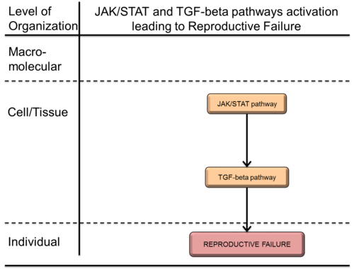 Titanium dioxide nanoparticles (TiO2NPs) are widely used nanoparticles (NPs) , whose catalytic activity is mainly due to photoactivation. UV activation influences toxicity of TiO2NPs, so in this AOP, UV-activated TiO2 nanoparticles were used as stressors. This AOP is constituted the KEs as JAK/STAT and TGF-beta pathways activation and AO as reproductive failure.