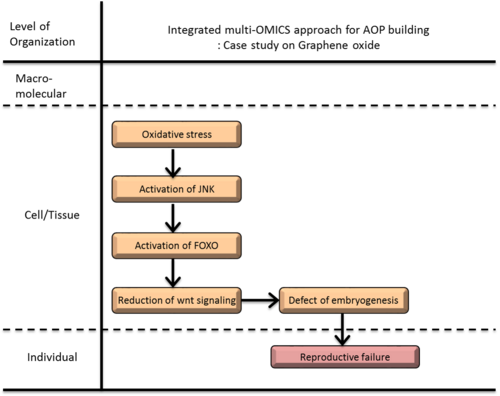 Systems toxicology approach using integrated omics can provide a comprehensive insight into the mechanism of toxicity and metabolic effects when profile new chemical toxicity. The comprehensive toxic mechanism of stress response of graphene oxide was investigated in C. elegans using transcriptomics, metabolomics and lipidomics. Based on these results, we construct AOP for oxidative stress leading to reproductive failure in C. elegans. This AOP is constituted the KEs as increased oxidative stress and activation of c-Jun N-terminal kinase (JNK) and the activation of transcription factor DAF-16/FOXO, inhibition of WNT signaling, defect embryogenesis and AO as reproductive failure.