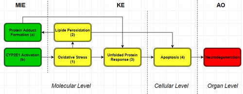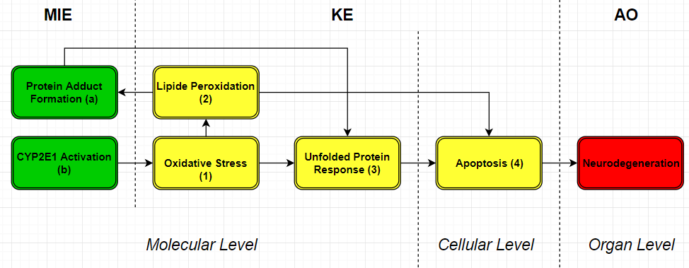 The AOP has two different MIEs: protein adduct formation (MIEa) and CYP2E1 activation (MIEb). Protein adduct formation is the interaction between a chemical, or reactive metabolite, and a protein at molecular level. During this interaction a covalent bond is formed which occurs due to the reaction between an electrophilic chemical and the nucleophilic part of a protein. When a chemical forms a covalent bond with a protein the protein is damaged and can loses its function. Acetaldehyde, the metabolite of ethanol, is also one of these chemicals known to form protein adducts. This is why protein adduct formation is added in this AOP based on ethanol. CYP2E1 is one of the enzymes responsible for the metabolism of ethanol, and because of this metabolic activity the MIE in added in this AOP. CYP2E1 participates in the metabolism of endogenous, small and hydrophobic compounds using a oxidation reaction. CYP2E1 is mainly expressed in rat liver cells, but can also be found in rat brain cells. Furthermore, in the human brain CYP2E1 expression is mainly found in the amygdala and prefrontal cortex. At higher concentrations of ethanol the expression of CYP2E1 increases, as well as the activity of CYP2E1 since it has a relatively high Km value for ethanol. In this AOP four different KEs are used, which are oxidative stress (KE1), lipid peroxidation (KE2), unfolded protein response (UPR) (KE3) and apoptosis (KE4). Oxidative stress can be defined as the imbalance between ROS and defence mechanisms against these ROS. ROS levels in a cell can rise which leads to damage by the oxidizing free radicals. Lipid peroxidation is a form of direct damage to lipids in the cell membrane or organelle membranes. The cell membrane will eventually break due to the build-up of all the damage. MDA and 4-hydroxynonenal (HNE) are two products of lipid peroxidation. UPR is a reaction activated by stress in the endoplasmic reticulum (ER). ER stress can be induced by too much protein folding which reaches a higher level than the folding capacity. Also accumulation of unfolded protein in the ER and protein adducts formation with important endoplasmic proteins can induce ER stress, which activates UPR. The final KE is apoptosis, which is programmed cell death in general. The process of apoptosis is well regulated and several signal proteins are known to induce the apoptotic process.