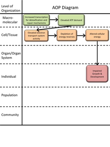 A graphical representation of the AOP.This graphic should list all KEs in sequence, including the MIE (if known) and AO, and the pair-wise relationships (links or KERs) between those KEs.