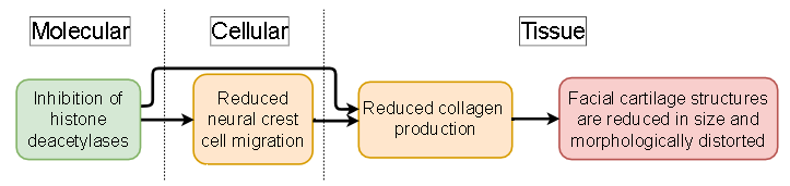 Histone deacetylases (HDACs) regulate gene expression through modulating chromatin structure and are known to impact many aspects of development in animals. Several compounds have been found to inhibit the action of HDACs leading to various adverse outcomes. This AOP aims to describe the sequence of events by which HDAC inhibition leads to impeded craniofacial development. The MIE is the inhibition, at early embryonic stages, of histone deacetylases. This leads to inhibition of cranial neural crest cell migration and inhibition of chondrocyte differentiation. The attenuation of chondrocyte differentiation reduces the production of collagen, a key structural component of cartilage, resulting in the reduced size and morphologically distorted facial cartilage features. This AOP concerns very specific developmental effects of an MIE which has very broad gene regulatory implications. This means that the progression through KEs and AO are mainly applicable at early developmental stages prior to neural crest migration and chondrocyte differentiation. The AOP is linked to case study 2, concerning the developmental and reproductive toxicity of valproic acid (VPA) and several structural homologs. One of the well-described developmental toxicity effects of fetal VPA exposure is craniofacial deformities.