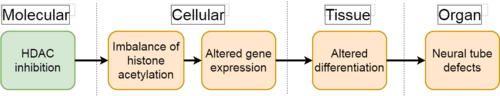 The expression and function of histone deacetylases (HDAC) are well known during embryonic development and especially plays a pivotal role in the development of the nervous system. HDAC inhibition during embryonic development has been correlated to several congenital malformations mainly affecting neurodevelopment. However, the kind of malformation strongly depends on the timing of disturbance, i.e. when during embryonic development the exposure occurred. This AOP concentrates on disturbances by HDAC inhibition during the first weeks of neurodevelopment, before or around the time point of neural tube closure. Therefore, this AOP suggests a mechanism how HDAC inhibitors could lead to the observed neural tube defects. It assumes that HDAC inhibition leads to an imbalance of histone modifications and eventually to altered gene expression. In the next KE altered gene expression may lead to a wrong differentiation of neuroectodermal cells that cannot close the neural tube anymore and therefore leads to neural tube closure defects. This AOP is linked to case study 2 that investigates the effects of VPA and its structural analogs the EU-ToxRisk DART (development and reproductive toxicology) test methods.
