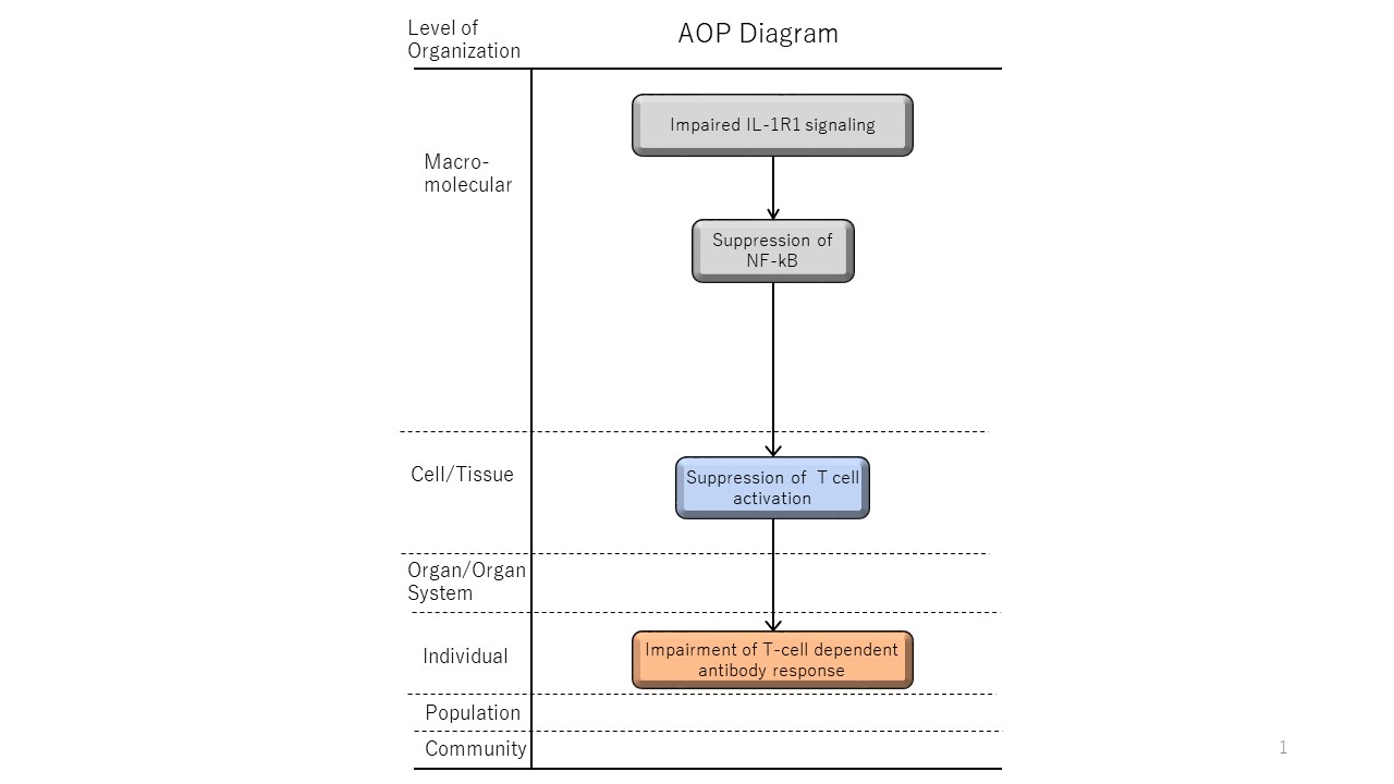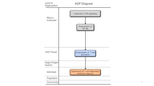 In this AOP, we selected the impaired IL-1R signaling as a molecular initiating event (MIE) in T cell, and suppression of NF-κB (and/or AP-1), suppression of T cell activation, and suppression of TDAR as key events (KE).