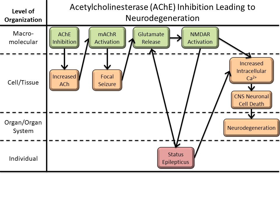 The enzyme acetylcholinesterase (AChE) hydrolyzes acetylcholine (ACh) in order to eliminate it from the body. When AChE is inhibited ACh levels increase. An excess of ACh at cholinergic synapses overstimulates both muscarinic- and nicotinic- receptors (1,2). These receptors are found in most organs in the body, thus the effects of AChE inhibition can result in multiple adverse outcomes affecting a wide variety of functions (1). This AOP focuses upon an acute outcome of neurodegeneration due to AChE inhibition specifically through calcium dysregulation as that has been identified as central to the development of the most severe phenotype caused by acute organophosphate poisoning (3).