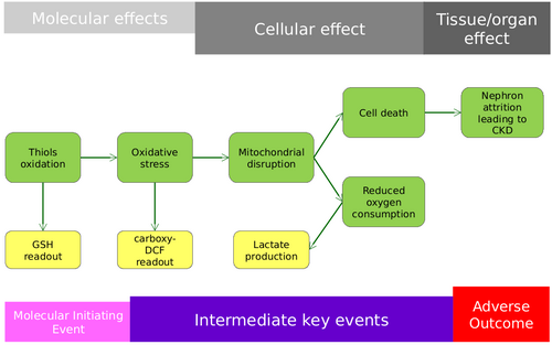 This AOP links thiol oxidation to CKD via oxidative and mitochondrial stress. Within the nephron, the proximal tubule is especially susceptible to injury from oxidative chemicals, as they can cause mitochondrial damage, which in turn can result in impairment of active and secondary transport, as well as in cell death. CKD is characterized by a progressive loss of renal function, the onset of which is initiated and/or accelerated by other factors such as diabetes, high blood pressure or exposure to nephrotoxic chemicals. Given its high energy demand for active transport, the proximal tubule is especially susceptible to injury from oxidative chemicals and mitotoxins.