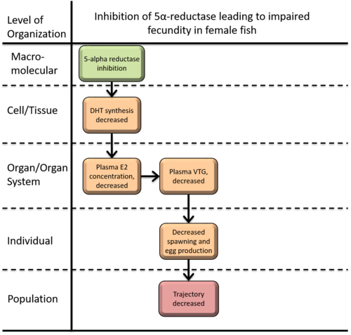 This AOP documents the scientifically credible links between inhibition of the enzyme 5areductase and reductions in cumulative fecundity in reproductively mature, female, teleost fish. Alteration of fecundity and spawning in fish is the critical apical endpoint for reproductive toxicity caused by endocrine disruption (e.g., OECD Test No. 229: Fish Short Term Reproduction Assay). This endpoint is essential and useful for screening of the potential endocrine disrupting chemicals and/or risk assessment sites contaminated by these chemicals. This AOP establishes that an in vitro assay that screens chemicals for their ability to inhibit 5a reductase is useful for identifying chemicals that may inhibit fish reproduction. It outlines several in vivo endpoints (e.g., reduction in circulating estrogen concentrations, reduction in circulating vitellogenin), that can be used to verify the probable reproductive outcomes without doing a completed OECD 229.