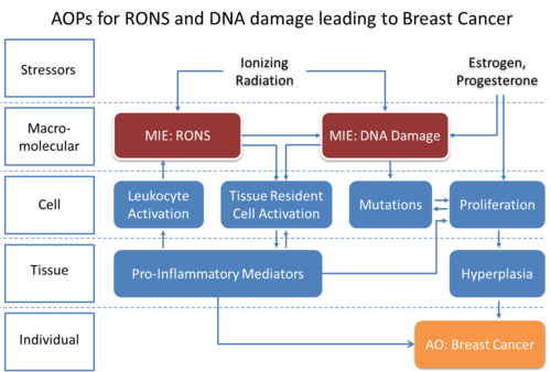 This AOP extends the characteristics of mammary carcinogens beyond DNA damage, highlighting the important role in breast cancer of chemicals that increase RONS, cell proliferation, and inflammation. Chemicals that increase these biological processes should be considered potential breast carcinogens, and predictive methods should be developed to identify chemicals that increase these processes. Ultimately, this AOP will improve methods that predict chemical breast carcinogens so that exposure can be reduced.
