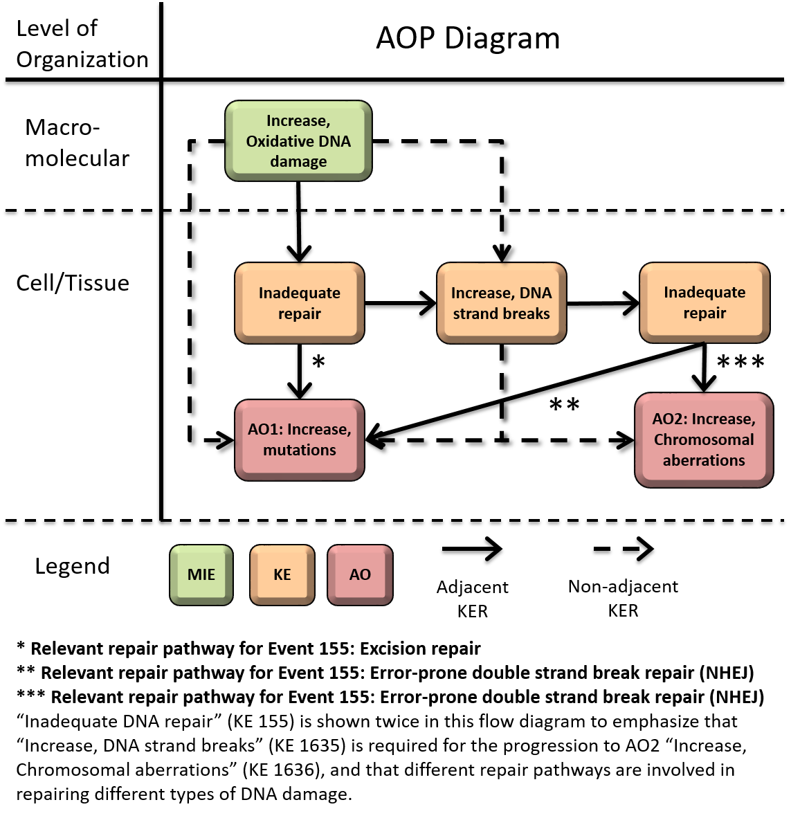 The molecular initiating event (MIE) of this AOP is increase in oxidative DNA damage, indicated by increases in oxidative DNA lesions. DNA in any cell type is susceptible to oxidative damage due to endogenous (e.g., aerobic respiration) and exogenous (i.e., exposure to oxidants) oxidative insults. Although this is the MIE for this AOP network, we note that there are numerous upstream key events (KE) that can also lead to DNA oxidation. Thus, we expect this AOP to be expanded upstream, and to be incorporated into a variety of AOP networks. Generally, cells are able to tolerate and readily repair oxidative DNA lesions by basal repair mechanisms. However, excessive damage can override the basal repair capacity and lead to inadequate repair of oxidative damage (KE1). Mutations (AO1) can arise from incorrect repair following oxidative damage (KE1), where incorrect bases are inserted opposite lesions during DNA replication. Insufficiently or incompletely repaired oxidative DNA lesions can also lead to DNA strand breaks (KE2) that, if insufficiently repaired (KE1), may result in chromosome aberrations (AO2) and/or mutations (AO1) following DNA replication.