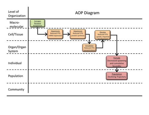 This adverse outcome pathway details the linkage between antagonism of estrogen receptor in females and the adverse effect of reduced cumulative fecundity in repeat-spawning fish species. Cumulative fecundity is the most apical endpoint considered in the OECD 229 Fish Short Term Reproduction Assay. The OECD 229 assay serves as screening assay for endocrine disruption and associated reproductive impairment (OECD 2012a). Cumulative fecundity is one of several variables known to be of demographic significance in forecasting fish population trends. Therefore, this AOP has utility in supporting the application of measures of ER antagonism, or in silico predictions of the ability to antagonize ER as a means to identify chemicals with known potential to adversely affect fish populations.