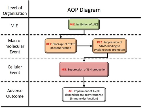 This proposed AOP consists of JAK3 inhibition as a MIE, blockade of STAT5 phosphorylation as the first key event (KE1), suppression of STAT5 binding to the promoter regions of cytokine genes as KE2, suppression of IL-4 production as KE3, and suppression of T cell dependent antibody response (TDAR) as an AO. This AOP especially focuses on the inhibition of JAK3, which is required for signal transduction by cytokines through the common γ chain of the receptors for IL-2, IL-4, IL-7, IL-9, IL-15, and IL-21. In the proposed AOP, JAK3 selective inhibitors that include PF-06651600 (CAS No: 1792180-81-4) and the 4-aminopiperidine-based compound RB1 are stressors. STAT5 that is phosphorylated by JAK3 forms a homo-dimer that translocate to the nucleus and induces expressions of genes, such as IL-4. Therefore, JAK3 inhibition leads to the suppressed binding of STAT5 to the promoter regions of cytokine genes and the subsequent suppression of IL-4 production. Thus, JAK/STAT regulation plays an important role in the TDAR. TDAR is frequently affected by immunosuppressive conditions and is a major endpoint in many preclinical immunotoxicity studies.