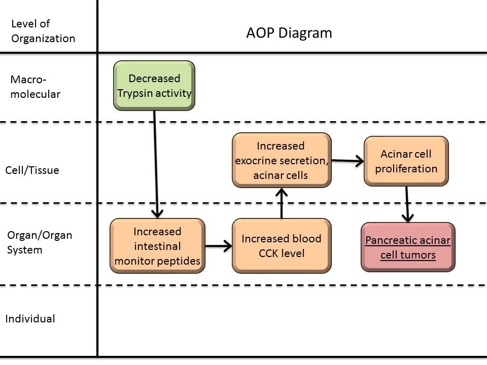 Therefore, the present AOP supports a pathway from trypsin inhibition to tumor formation originating from pancreatic acinar cells in rodents. The relevance of these findings to humans seems low, although some evidence of a TI-induced increase in blood CCK levels suggests the need for case-by-case risk assessment of pancreatic cancer in humans.