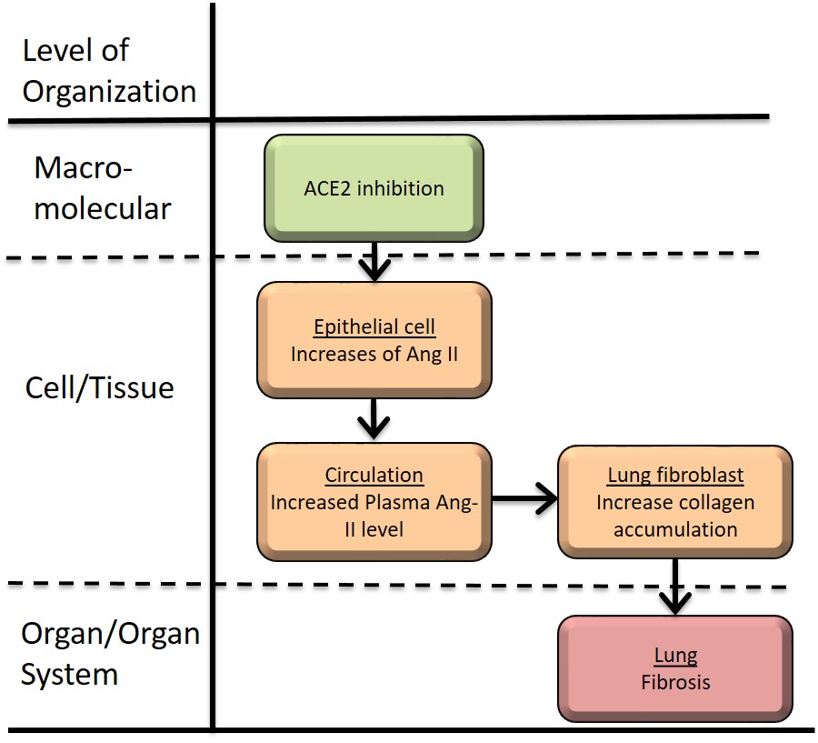 Lung fibrosis has a distinct point in idiopathic pulmonary fibrosis from the renin-angiotensin pathway. this system is reported in many works of literature to share many immune/inflammatory responses to lung damage. When ACE2 activity is inhibited, Ang II is not effectively converted into Ang-(1-7). Because of this, the levels of proinflammatory Ang II are increased and accumulated, while the levels of anti-inflammatory Ang-(1-7) are reduced. Most importantly, the Inhibition of ACE2 was shown to enhance the level of Ang II peptides which is a ligand for type 1 angiotensin receptor (AT1R) and is considered one of the risk factors for lung fibrosis, vasoconstriction, endothelial dysfunction, and cell death. The imbalance of the renin-angiotensin system (RAS) plays a critical role in the fibrogenesis and inflammation damage of many organs. Especially the inhibition of membrane ACE-2 enzymatic activity has shown promising potential in the Molecular initiation event which leads to pulmonary fibrosis. This AOP describes the role of ACE-2 in fibrotic damage of the lung as an adverse outcome through the fibrogenic components, proinflammatory cytokines, and oxygen deficiency.