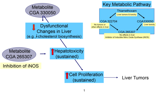 Three metabolites (i.e., CGA 322704 and CGA 330050 which are further metabolize to CGA 265307) were identified and systematically evaluated for toxicological contribution to the sequence of hepatic effects. Mice and rats both produce CGA322704 as a major blood metabolite, which suggests that this particular metabolite is not an indicator of a species difference. However, CGA322704 does not cause liver tumors in mice nor does it cause any of the hepatic changes seen with thiamethoxam, and is thus considered not to be a part of causative chain of hepatic events. In contrast, CGA265307 and CGA330050 are produced in substantially greater quantity by mice than by rats (up to 140-fold and 15-fold greater, respectively), suggesting that the metabolic pathway through CGA330050 is critical to the AOP. In studies where these metabolites were fed to mice for at least ten weeks, CGA330050 was found to induce the same hepatic effects, and to the same degree, as thiamethoxam. CGA265307 alone induced none of the clinical or histopathological changes seen in the thiamethoxam-treated mice.