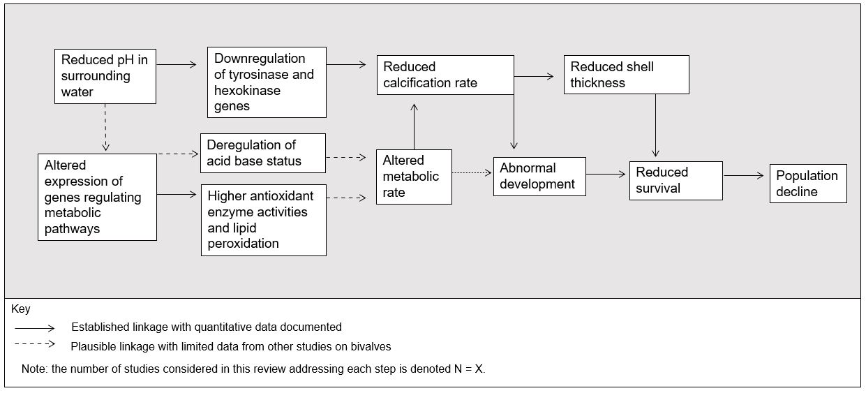 Preliminary AOP for Mytilus edulis indicates that OA has a myriad of repercussions across biological levels, with multiple potential adverse outcomes to consider. The impacts are interconnected and demonstrate how molecular processes may affect whole-organism processes. The studies considering M. edulis provide a comprehensive AOP as it is a well-studied species, with most impacts at individual (whole-organism) level.