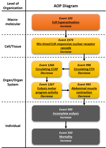 This AOP describes how hyperactivation of the ecdysone receptor (EcR) initiates a cascade of mis-timed nuclear receptor signaling, disrupting the tightly regulated endocrine control of insect molting. Dysregulation of key neuropeptides (ETH, CCAP) and subsequent impairment of motor programs and abdominal muscle contractions lead to incomplete ecdysis. Failure to properly shed the cuticle results in increased mortality.