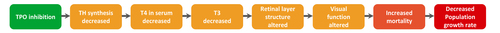 Visual function is particularly important for survival, especially of developing life stages. Some chemicals, including thyroid hormone system disrupting chemicals (THSDCs), can impair eye development. The chain of events, from the molecular interaction of thyroid hormone system disruption (THSD) to the consequences at the level of vision, is not yet fully understood. The development of this AOP aims to contribute to filling these gaps and investigates how inhibition of the enzyme thyroperoxidase and resulting changes in thyroid hormone(TH) levels can lead to effects on the retinal layers and subsequently at the population level.