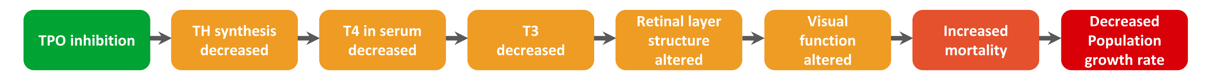 The linkage between the MIE, decreased T3, and the KE of altered retinal layer structure, is evident in the different vertebrate classes. There is ample evidence that THs have an influence on the development of the retinal layer structure. Although there are some differences in eye structure between species, it is known that the retina follows the typical organisation of vertebrates. Within vertebrates, it consists of several layers such as the retinal pigment epithelium (RPE), photoreceptors, neurons and choroid. It is plausible to assume that TH levels are important for healthy eye development in all vertebrates.